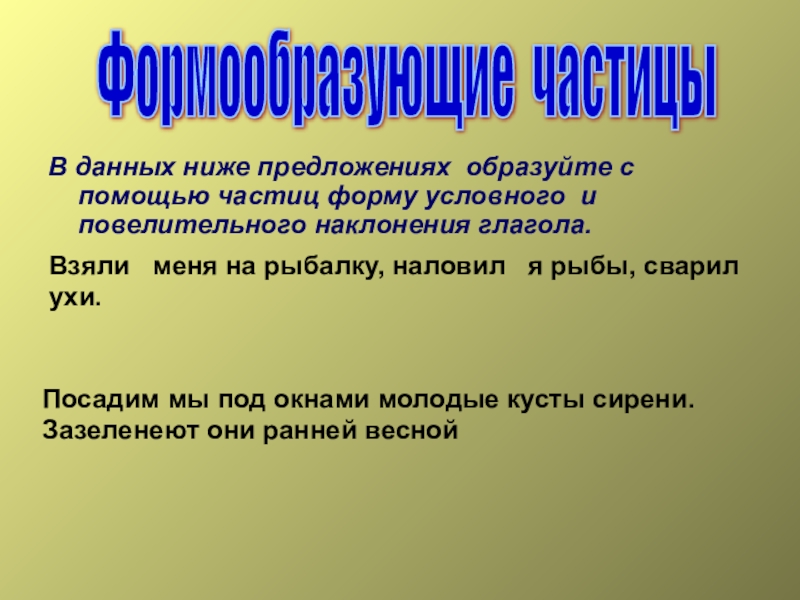 В данных ниже предложениях образуйте с помощью частиц форму условного и повелительного наклонения глагола.