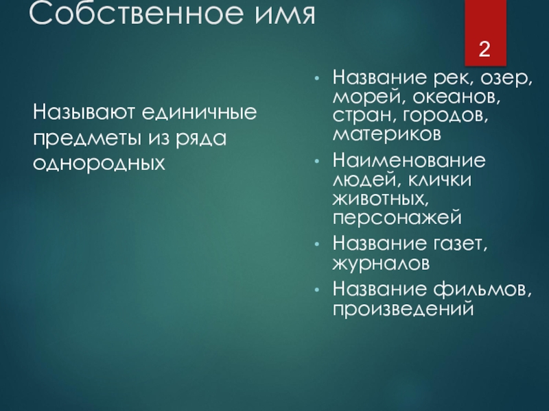 Собственное имяНазывают единичные предметы из ряда однородныхНазвание рек, озер, морей, океанов, стран, городов, материковНаименование людей, клички животных,