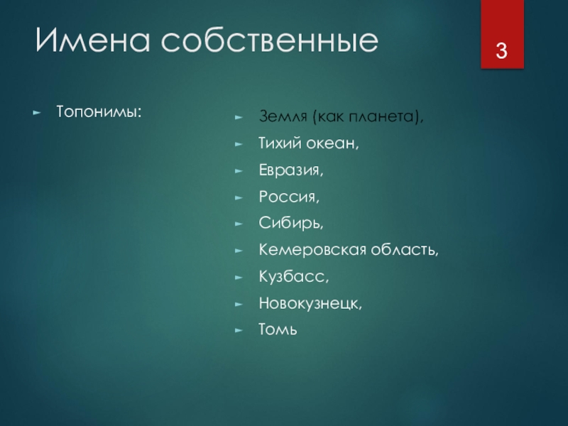 Имена собственныеТопонимы:Земля (как планета), Тихий океан, Евразия, Россия, Сибирь, Кемеровская область, Кузбасс, Новокузнецк, Томь