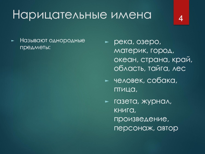 Нарицательные именаНазывают однородные предметы:река, озеро, материк, город, океан, страна, край, область, тайга, лесчеловек, собака, птица, газета, журнал,