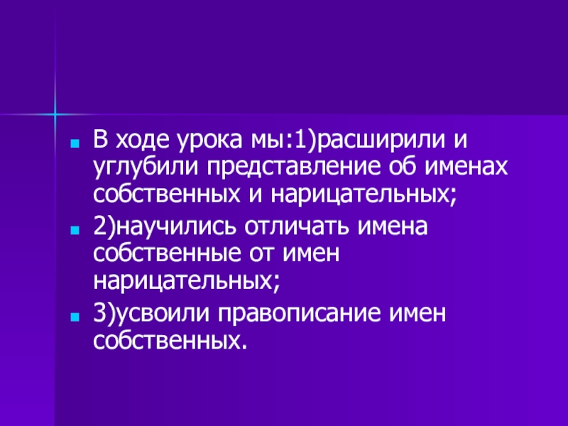 В ходе урока мы:1)расширили и углубили представление об именах собственных и