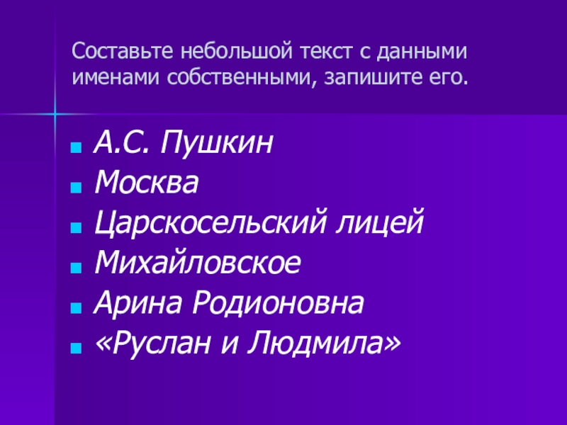 Слайд 38Составьте небольшой текст с данными именами собственными, запишите его.
