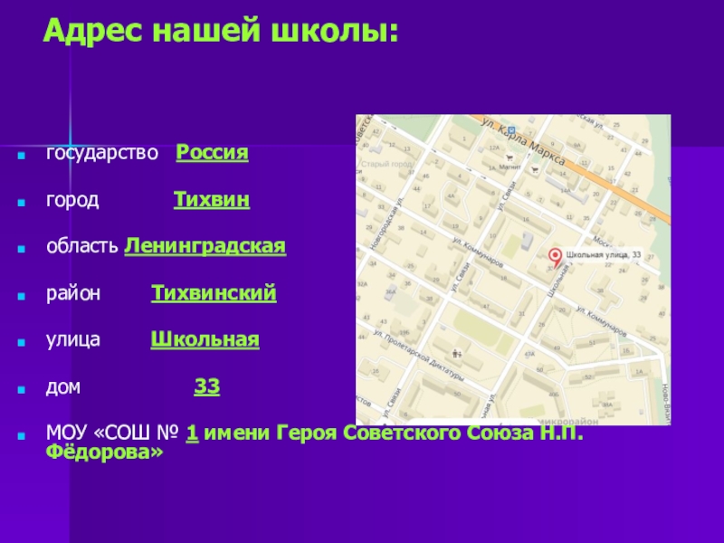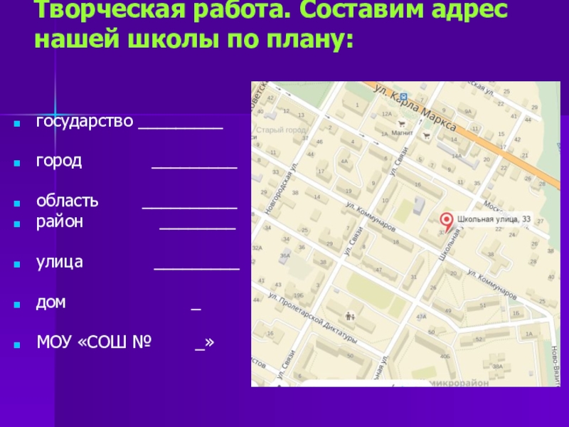 Слайд 31Творческая работа. Составим адрес нашей школы по плану: