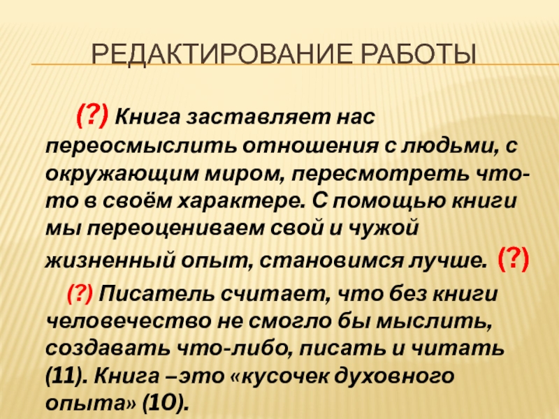 (9) Книга… (10) Это ведь кусочек духовного опыта человечества. (11) Читая, мы вольно или невольно перерабатываем этот опыт, сопоставляем с ним свои жизненные приобретения и потери.