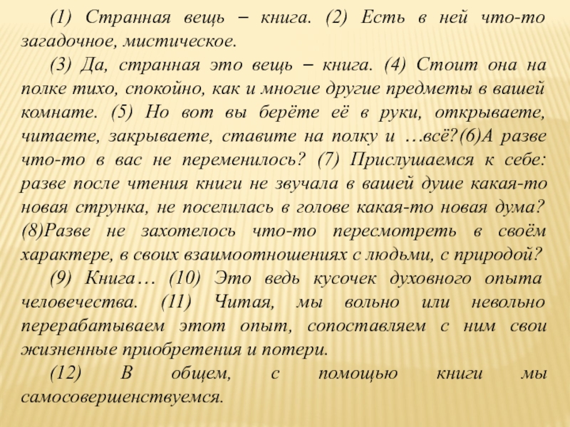 (3) Да, странная это вещь – книга. (4) Стоит она на полке тихо, спокойно, как и многие другие предметы в вашей комнате. (5) Но вот вы берёте её в руки, открываете, читаете, закрываете, ставите на полку и …всё?(6)А разве что-то в вас не переменилось? (7) Прислушаемся к себе: разве после чтения книги не звучала в вашей душе какая-то новая струнка, не поселилась в голове какая-то новая дума? (8)Разве не захотелось что-то пересмотреть в своём характере, в своих взаимоотношениях с людьми, с природой?