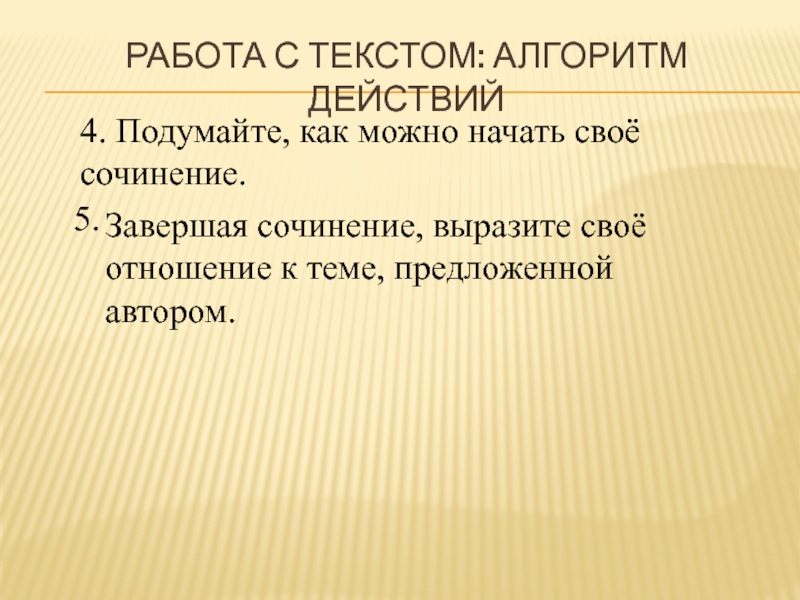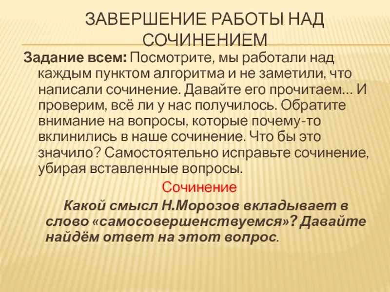 алгоритма и не заметили, что написали сочинение. Давайте его прочитаем… И проверим, всё ли у нас получилось. Обратите внимание на вопросы, которые почему-то вклинились в наше сочинение. Что бы это значило? Самостоятельно исправьте сочинение, убирая вставленные вопросы.