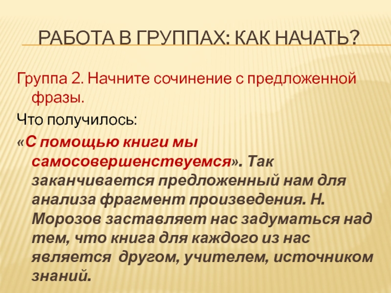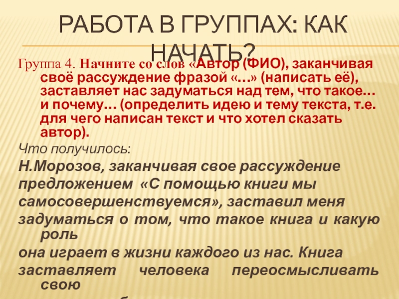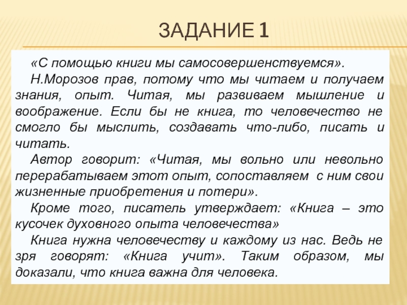 «С помощью книги мы самосовершенствуемся». Так заканчивается предложенный нам для анализа фрагмент произведения. Н.Морозов заставляет нас задуматься над тем, что книга для каждого из нас является другом, учителем, источником знаний.