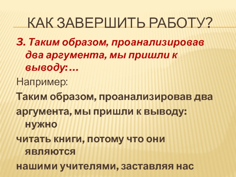 (?) Проанализировав два аргумента, мы пришли к выводу: нужно читать книги, потому что они являются нашими учителями, заставляя нас становиться лучше.