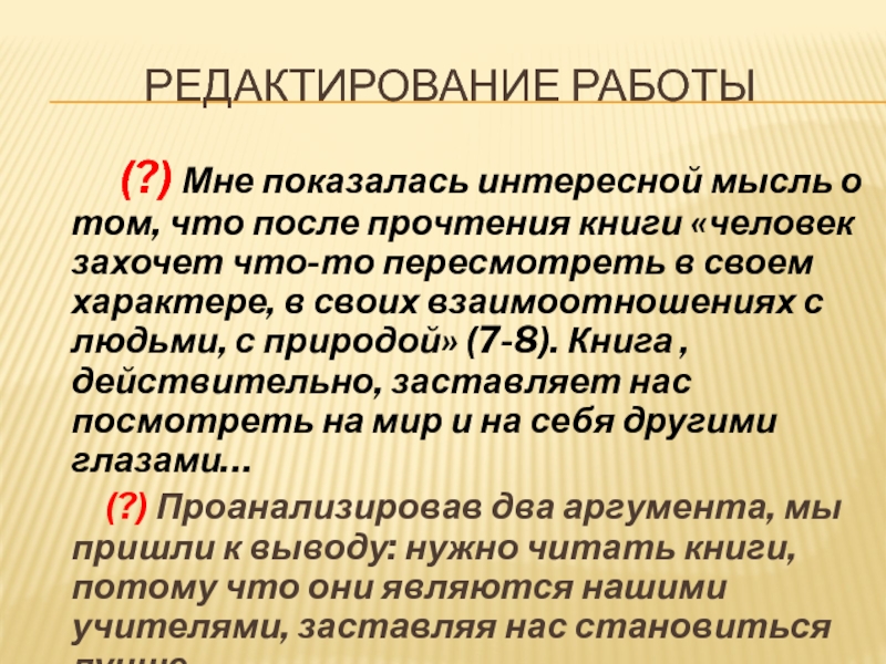 отношения с людьми, с окружающим миром, пересмотреть что-то в своём характере. С помощью книги мы переоцениваем свой и чужой жизненный опыт, становимся лучше. (?)