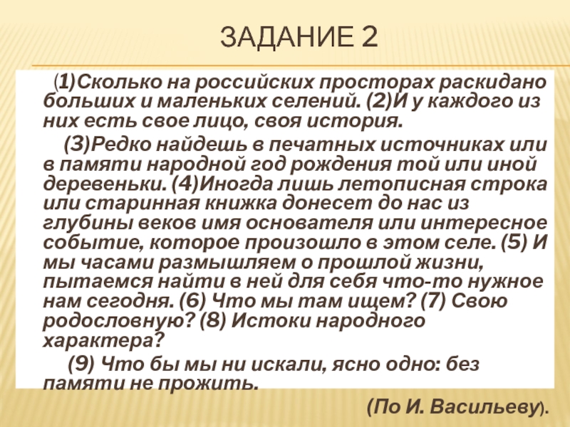 (3)Редко найдешь в печатных источниках или в памяти народной год рождения той или иной деревеньки. (4)Иногда лишь летописная строка или старинная книжка донесет до нас из глубины веков имя основателя или интересное событие, котоpoe произошло в этом селе. (5) И мы часами размышляем о прошлой жизни, пытаемся найти в ней для себя что-то нужное нам сегодня. (6) Что мы там ищем? (7) Свою родословную? (8) Истоки народного характера?