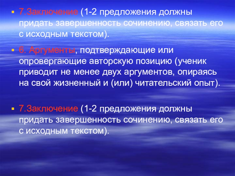 7.Заключение (1-2 предложения должны придать завершенность сочинению, связать его с исходным текстом).