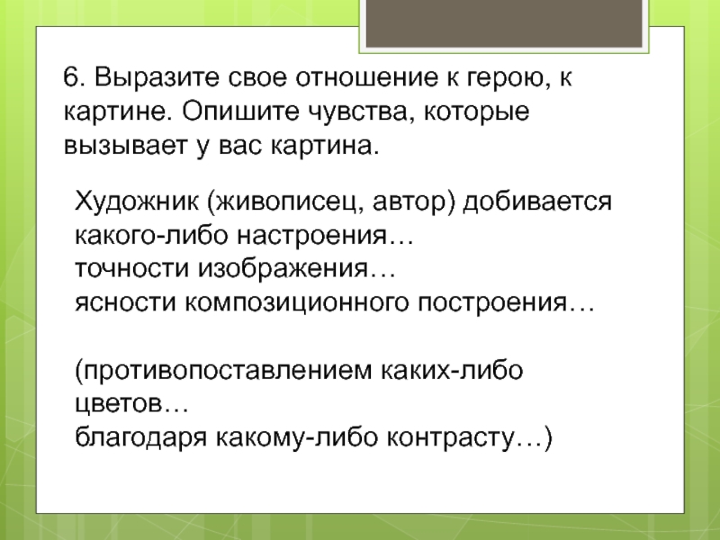 6. Выразите свое отношение к герою, к картине. Опишите чувства, которые вызывает у вас картина.