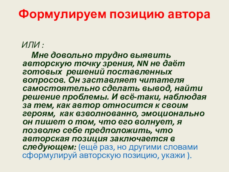 Мне довольно трудно выявить авторскую точку зрения, NN не даёт готовых решений поставленных вопросов. Он заставляет читателя самостоятельно сделать вывод, найти решение проблемы. И всё-таки, наблюдая за тем, как автор относится к своим героям, как взволнованно, эмоционально он пишет о том, что его волнует, я позволю себе предположить, что авторская позиция заключается в следующем: (ещё раз, но другими словами сформулируй авторскую позицию, укажи ).