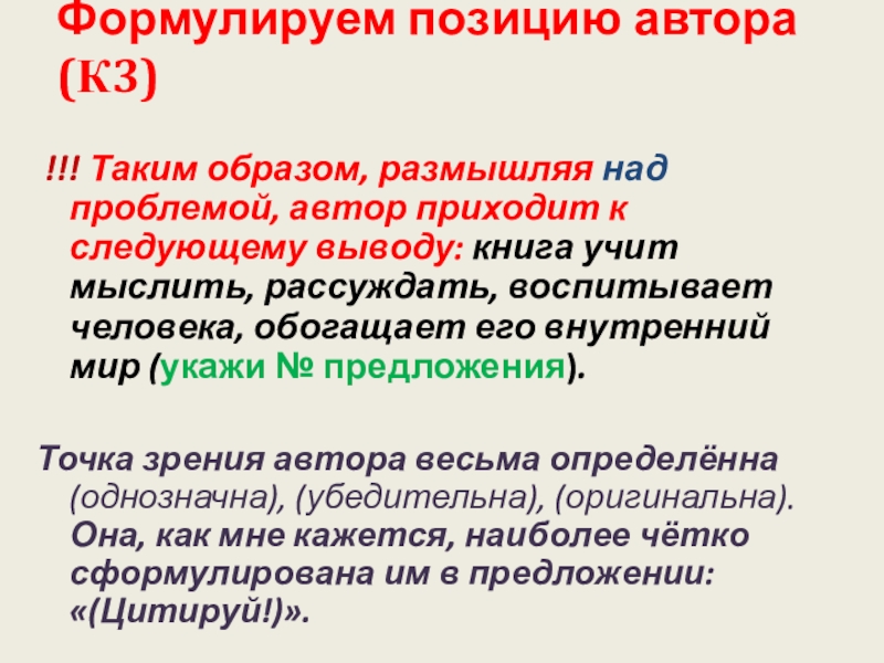 Точка зрения автора весьма определённа (однозначна), (убедительна), (оригинальна). Она, как мне кажется, наиболее чётко сформулирована им в предложении: «(Цитируй!)».