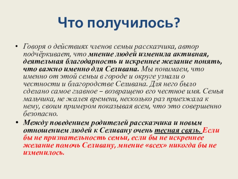 Между поведением родителей рассказчика и новым отношением людей к Селивану очень тесная связь. Если бы не признательность семьи, если бы не искреннее желание помочь Селивану, мнение «всех» никогда бы не изменилось.