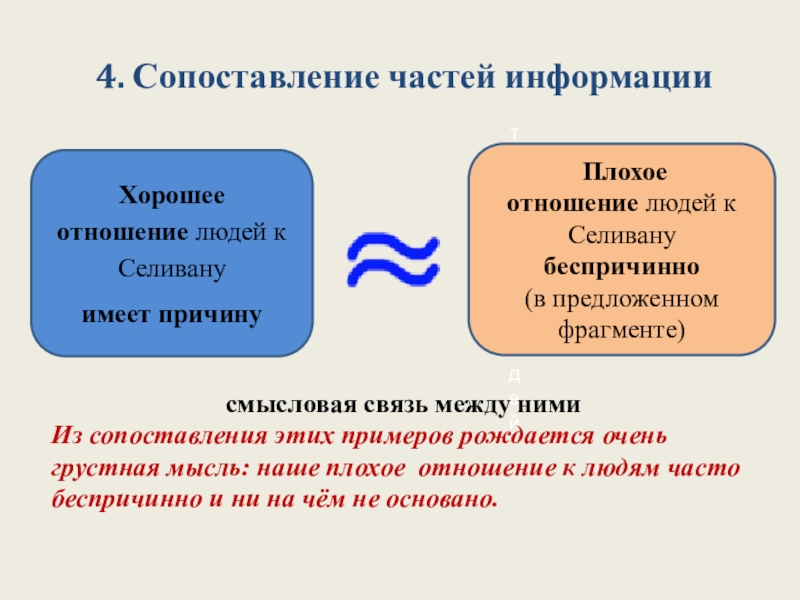 Из сопоставления этих примеров рождается очень грустная мысль: наше плохое отношение к людям часто беспричинно и ни на чём не основано.