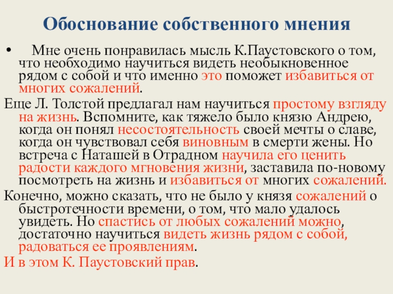 Еще Л. Толстой предлагал нам научиться простому взгляду на жизнь. Вспомните, как тяжело было князю Андрею, когда он понял несостоятельность своей мечты о славе, когда он чувствовал себя виновным в смерти жены. Но встреча с Наташей в Отрадном научила его ценить радости каждого мгновения жизни, заставила по-новому посмотреть на жизнь и избавиться от многих сожалений.