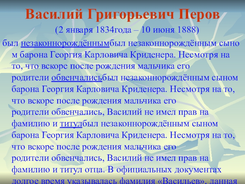 барона Георгия Карловича Криденера. Несмотря на то, что вскоре после рождения мальчика его родители обвенчалисьбыл незаконнорождённым сыном барона Георгия Карловича Криденера. Несмотря на то, что вскоре после рождения мальчика его родители обвенчались, Василий не имел прав на фамилию и титулбыл незаконнорождённым сыном барона Георгия Карловича Криденера. Несмотря на то, что вскоре после рождения мальчика его родители обвенчались, Василий не имел прав на фамилию и титул отца. В официальных документах долгое время указывалась фамилия «Васильев», данная по имени крёстного отцабыл незаконнорождённым сыном барона Георгия Карловича Криденера. Несмотря на то, что вскоре после рождения мальчика его родители обвенчались, Василий не имел прав на фамилию и титул отца. В официальных документах долгое время указывалась фамилия «Васильев», данная по имени крёстного отца. Фамилия «Перов» возникла как прозвище, данное мальчику его учителем грамоты, заштатным дьячком, который этим прозвищем отметил своего ученика за усердие и умелое владение пером для письма[1].