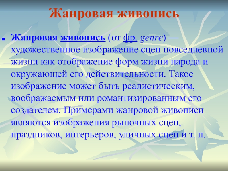 Жанровая живопись (от фр. genre) — художественное изображение сцен повседневной жизни как отображение форм жизни