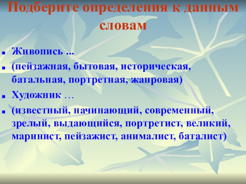 (известный, начинающий, современный, зрелый, выдающийся, портретист, великий, маринист, пейзажист, анималист, баталист)