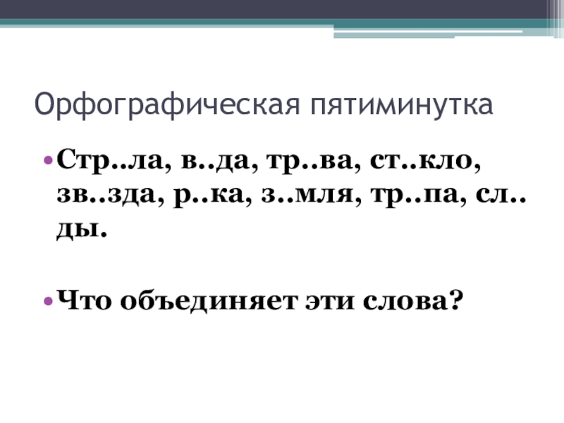 Стр..ла, в..да, тр..ва, ст..кло, зв..зда, р..ка, з..мля, тр..па, сл..ды.