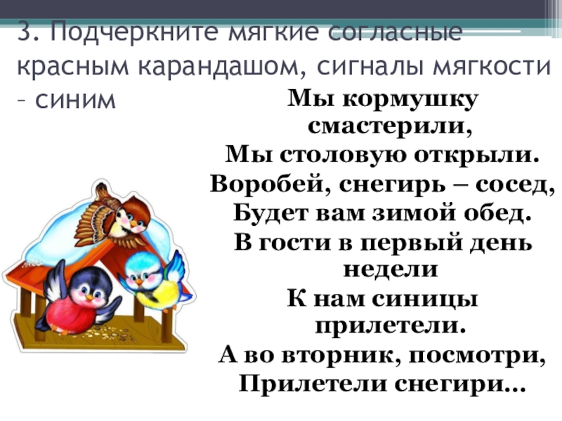 Слайд 113. Подчеркните мягкие согласные красным карандашом, сигналы мягкости – синим