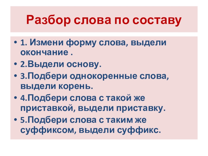Разбор слова по составу1. Измени форму слова, выдели окончание .2.Выдели основу.3.Подбери однокоренные слова, выдели корень.4.Подбери слова с