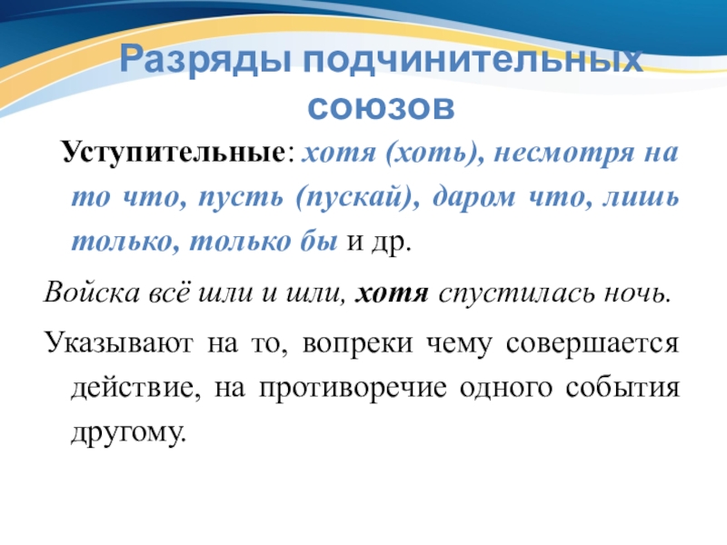Указывают на то, вопреки чему совершается действие, на противоречие одного события другому.