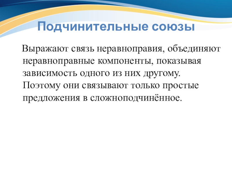 зависимость одного из них другому. Поэтому они связывают только простые предложения в сложноподчинённое.