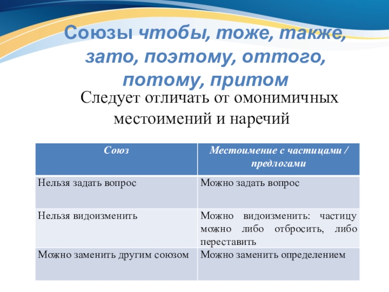 Союзы чтобы, тоже, также, зато, поэтому, оттого, потому, притом