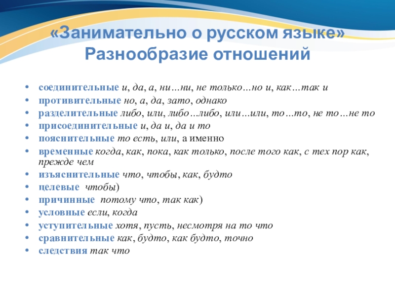 Разделительные: или (иль), либо, то – то, не то – не то, то ли – то ли, или – или. Колокольчик в молчании бора то замрёт, то опять запоёт (И.А. Бунин).