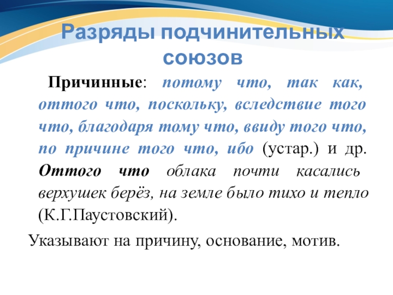 вследствие того что, благодаря тому что, ввиду того что, по причине того что, ибо (устар.) и др. Оттого что облака почти касались верхушек берёз, на земле было тихо и тепло (К.Г.Паустовский).