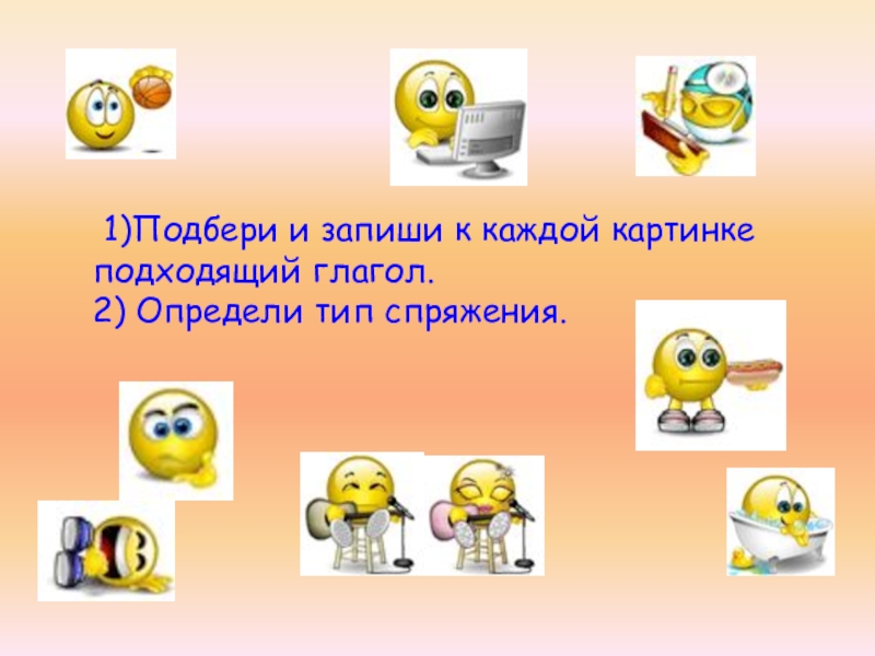 Слайд 20 1)Подбери и запиши к каждой картинке подходящий глагол. 2) Определи тип спряжения.