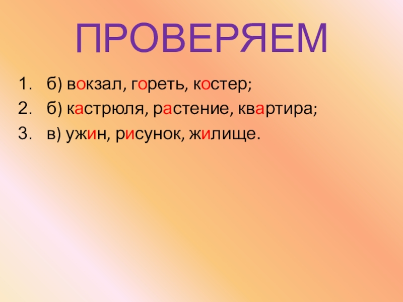 ПРОВЕРЯЕМб) вокзал, гореть, костер; б) кастрюля, растение, квартира;в) ужин, рисунок, жилище.