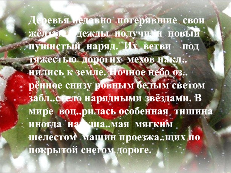 ветви под тяжестью дорогих мехов накл..нились к земле. Ночное небо оз..рённое снизу ровным белым светом забл..стело нарядными звёздами. В мире воц..рилась особенная тишина иногда наруша..мая мягким шелестом машин проезжа..щих по покрытой снегом дороге.