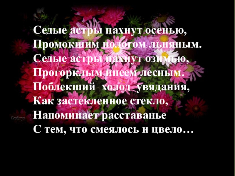 Седые астры пахнут осенью, Промокшим пологом льняным. Седые астры пахнут озимью, Прогорклым инеем лесным. Поблекший холод увядания,