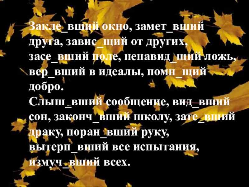 Слайд 2Закле_вший окно, замет_вший друга, завис_щий от других, засе_вший поле, ненавид_щий ложь,
