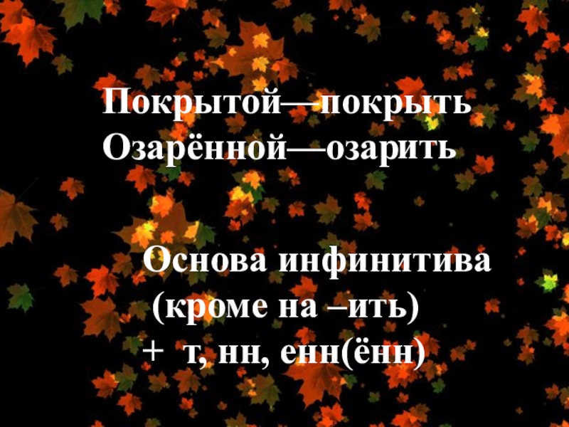 Покрытой—покрыОзарённой—озартьитьОснова инфинитива (кроме на –ить) + т, нн, енн(ённ)