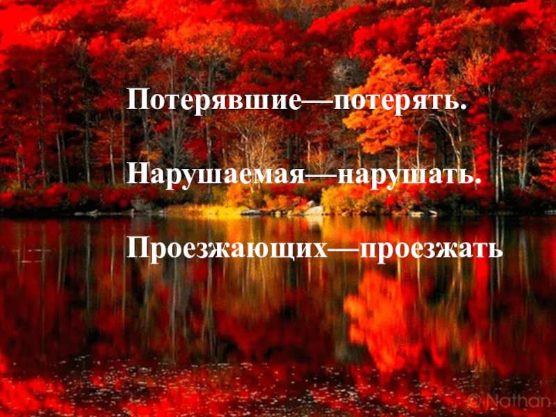 Потерявшие—потерять.Нарушаемая—нарушать.Проезжающих—проезжать