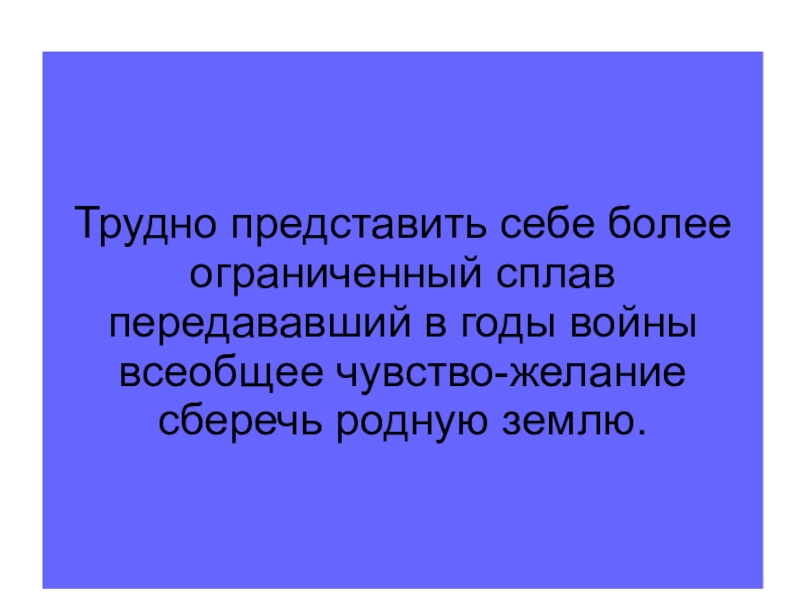 Трудно представить себе более ограниченный сплав передававший в годы войны всеобщее чувство-желание сберечь родную землю.