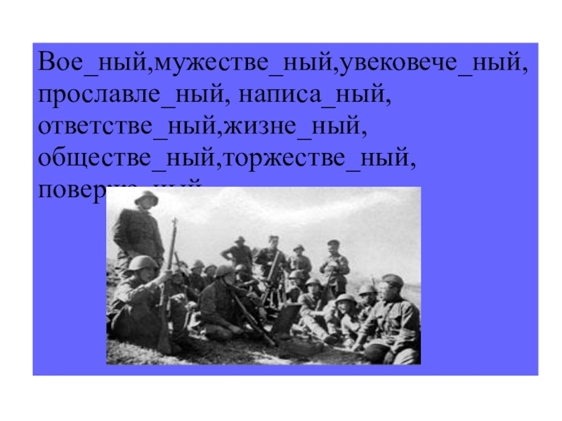 Слайд 5Вое_ный,мужестве_ный,увековече_ный,прославле_ный, написа_ный,ответстве_ный,жизне_ный,обществе_ный,торжестве_ный,поверже_ный.