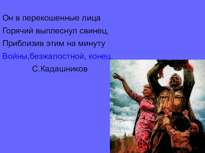 Он в перекошенные лицаГорячий выплеснул свинец,Приблизив этим на минутуВойны,безжалостной, конец.       С.Кадашников