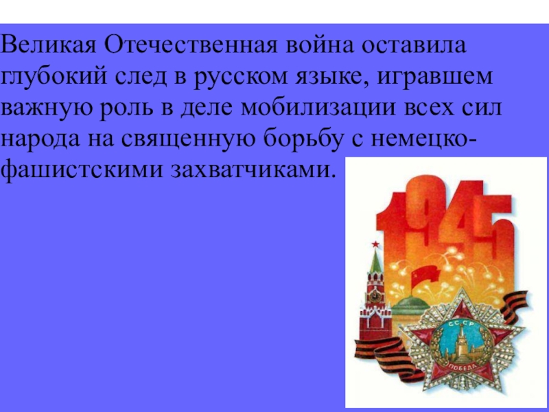 Великая Отечественная война оставила глубокий след в русском языке, игравшем важную роль в деле мобилизации всех сил