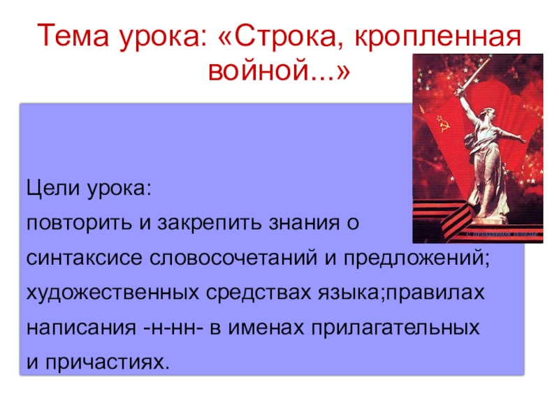 Тема урока: «Строка, кропленная войной...»Цели урока: повторить и закрепить знания о синтаксисе словосочетаний и предложений;художественных средствах языка;правилахнаписания -н-нн- в именах прилагательныхи причастиях.