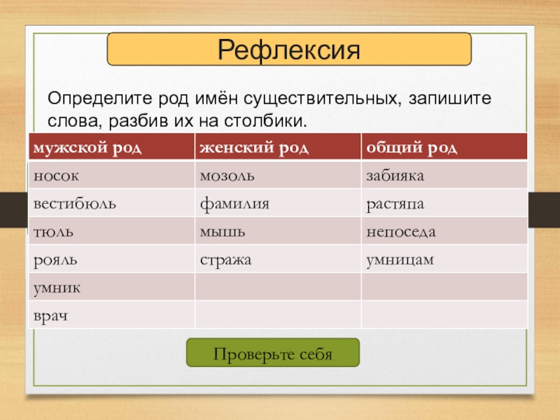 Определите род имён существительных, запишите слова, разбив их на столбики.