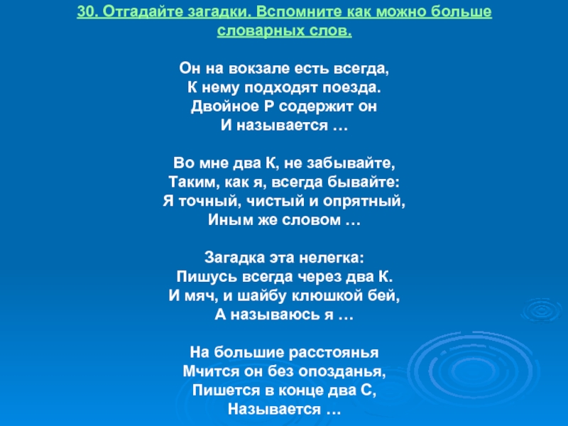 Слайд 2830. Отгадайте загадки. Вспомните как можно больше словарных слов.
