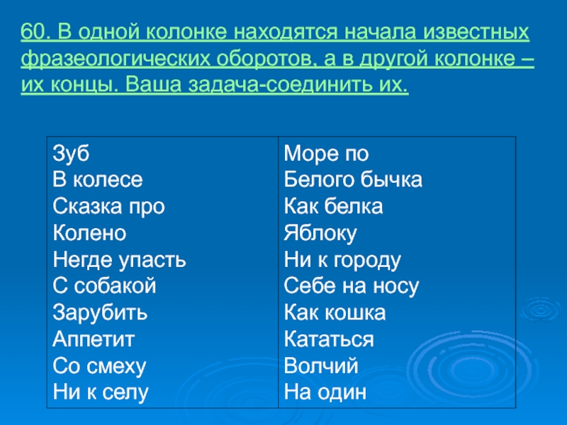 Слайд 3160. В одной колонке находятся начала известных фразеологических оборотов, а в