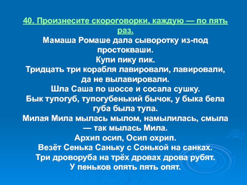 Слайд 2940. Произнесите скороговорки, каждую — по пять раз.