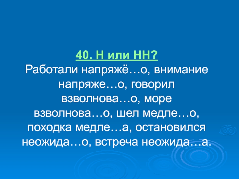 Работали напряжё…о, внимание напряже…о, говорил взволнова…о, море взволнова…о,