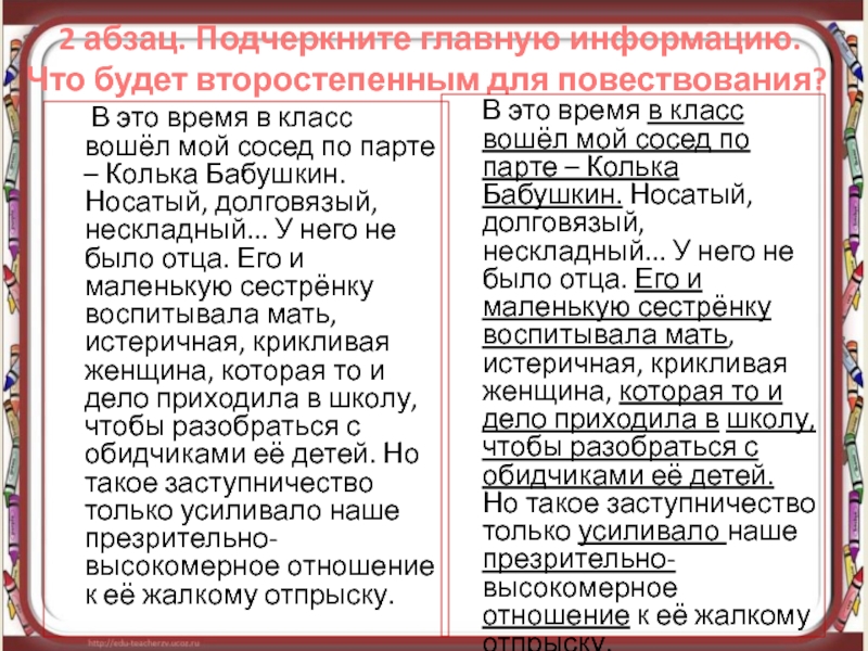 В это время в класс вошёл мой сосед по парте – Колька Бабушкин. Носатый, долговязый, нескладный... У него не было отца. Его и маленькую сестрёнку воспитывала мать, истеричная, крикливая женщина, которая то и дело приходила в школу, чтобы разобраться с обидчиками её детей. Но такое заступничество только усиливало наше презрительно-высокомерное отношение к её жалкому отпрыску.
